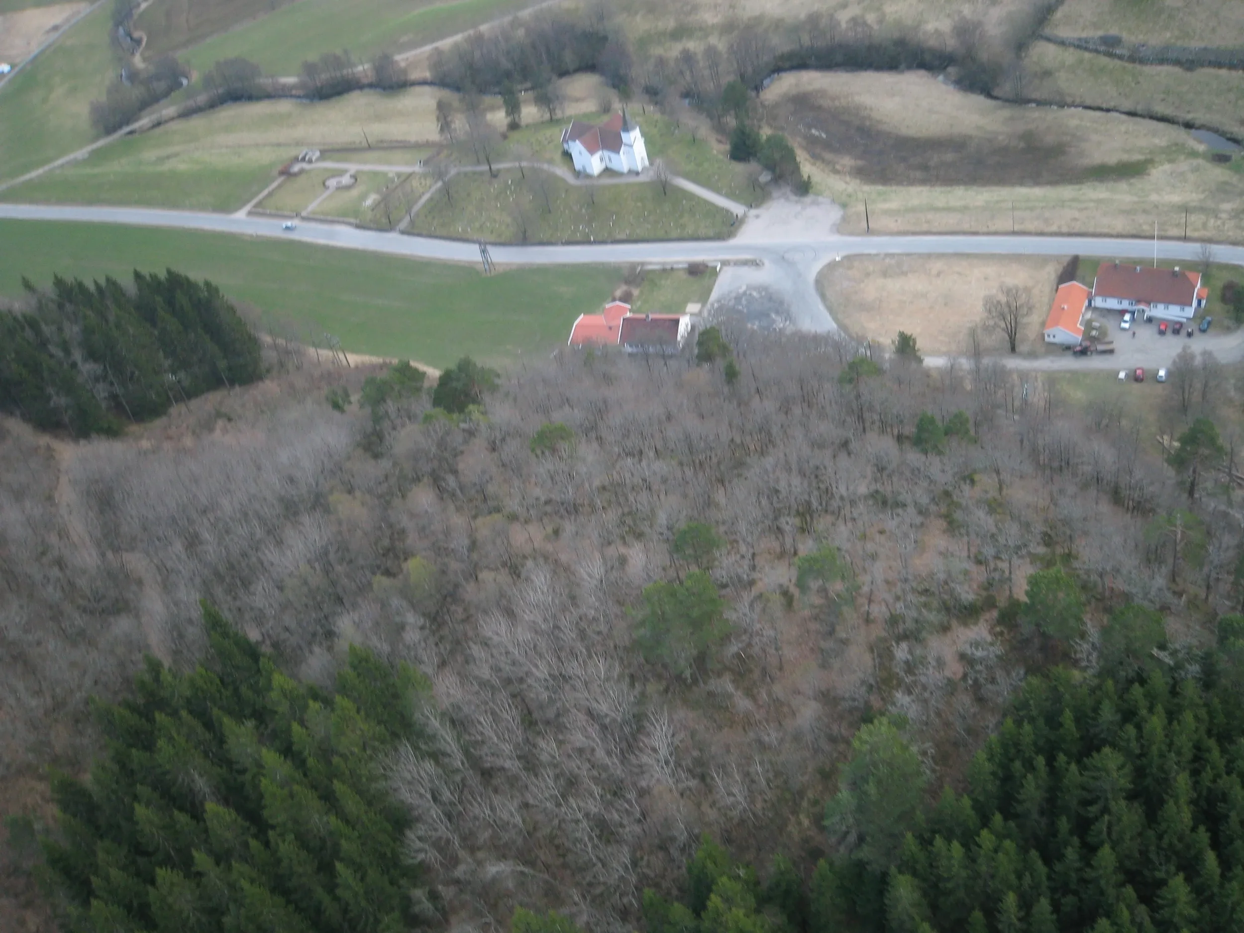 Utsikt fra Prestefjellet og bygdeborgen ned mot Øvrebø kirke