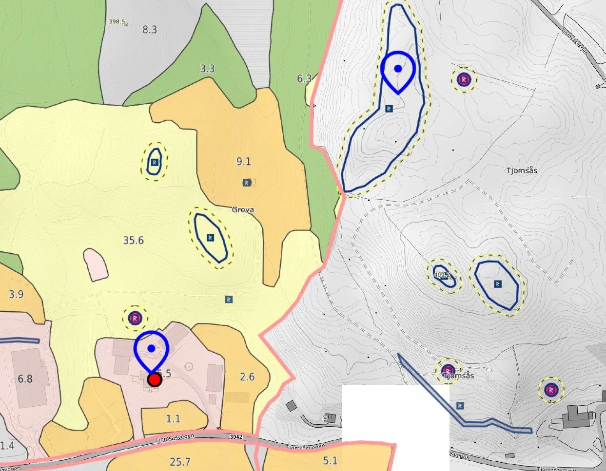 I innmarka og beitemarka på Tjomsås, og særlig på det høgstliggende området (Røysebrokka) imellom alle gardsbruka, ligger det 26 gravhauger fra jernalderen, noen runde og noen lange. Dessuten er det funnet en fallos-stein (en stein som likner den mannlige kjønnslemmen) «Der vest» på Tjomsås. Den hadde vel noe med fruktbarhetsdyrking å gjøre. Den står utstilt på et museum på Tingvatn i Hægebostad.