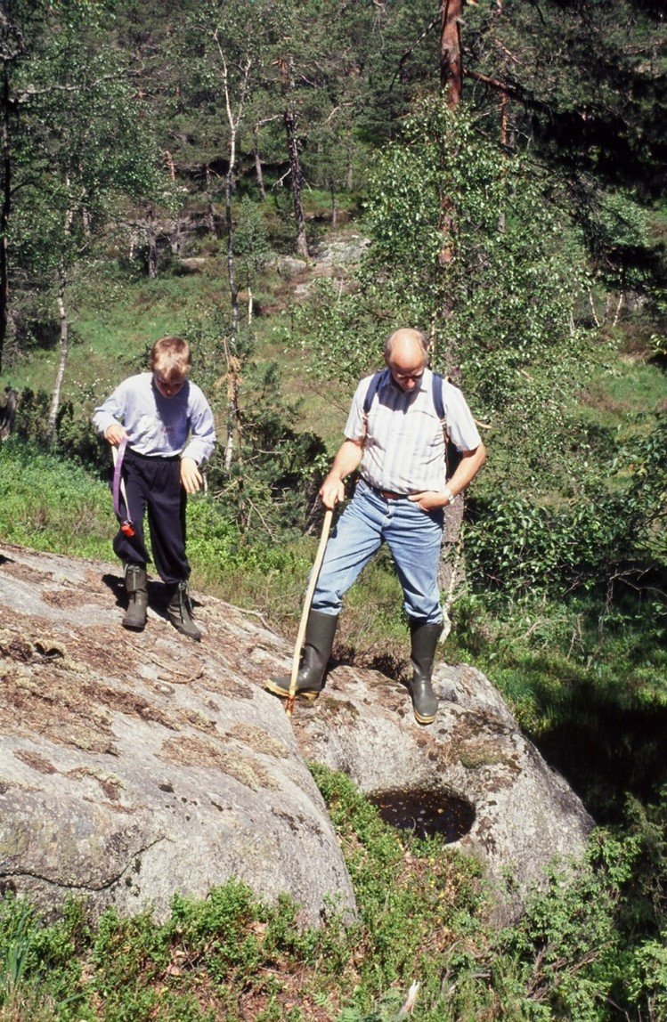 Her står vi altså ved et sted der Norges mest bereiste person en gang har vært. Nevn den bygda eller kommunen her i landet som ikke har hatt besøk av Olav den hellige. Her gikk han altså forbi, ble tørst, slengte hatten sin i berget slik at merket etter hattekulen ble sittende der, og så drakk han vannet som samlet seg der. Hvorfor han ikke bare gikk ned i bekken fra Stemvannet, ja, det er det ingen som vet.