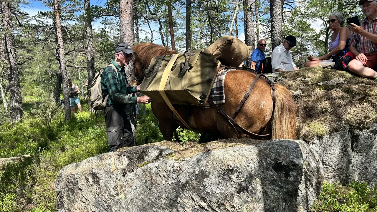 Her er tauet spent slik at hver meis vippes ut fra sidene på hesten. Det er å stake kløva. Foto: Torfinn Normann Hageland, 2000.