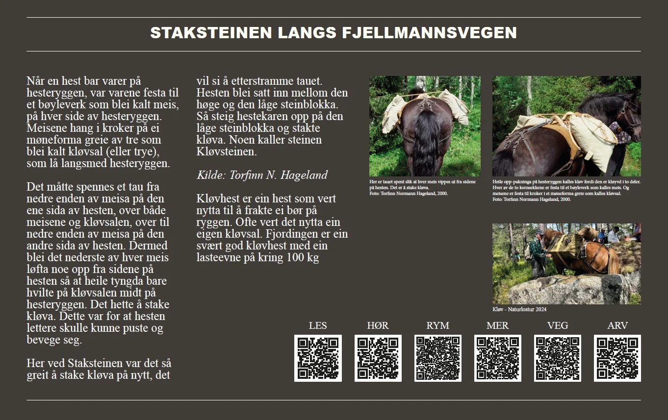 Her ved Staksteinen var det så greit å stake kløva på nytt, det vil si å etterstramme tauet. Hesten blei satt inn mellom den høge og den låge steinblokka. Så steig hestekaren opp på den låge steinblokka og stakte kløva. Noen kaller steinen Kløvsteinen.