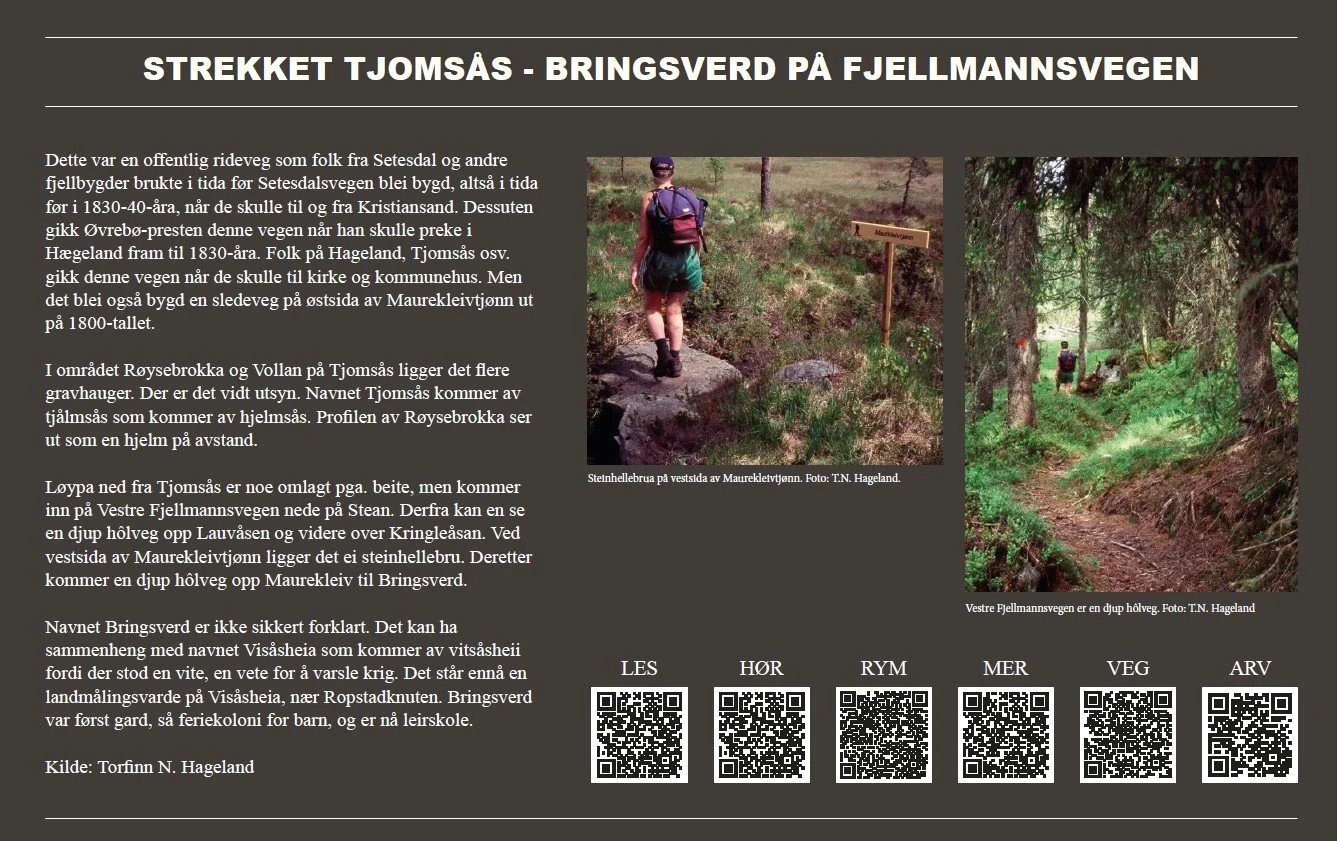 Løypa ned fra Tjomsås er noe omlagt pga. beite, men kommer inn på Vestre Fjellmannsvegen nede på Stean. Derfra kan en se en djup hôlveg opp Lauvåsen og videre over Kringleåsan. Ved vestsida av Maurekleivtjønn ligger det ei steinhellebru. Deretter kommer en djup hôlveg opp Maurekleiv til Bringsverd.